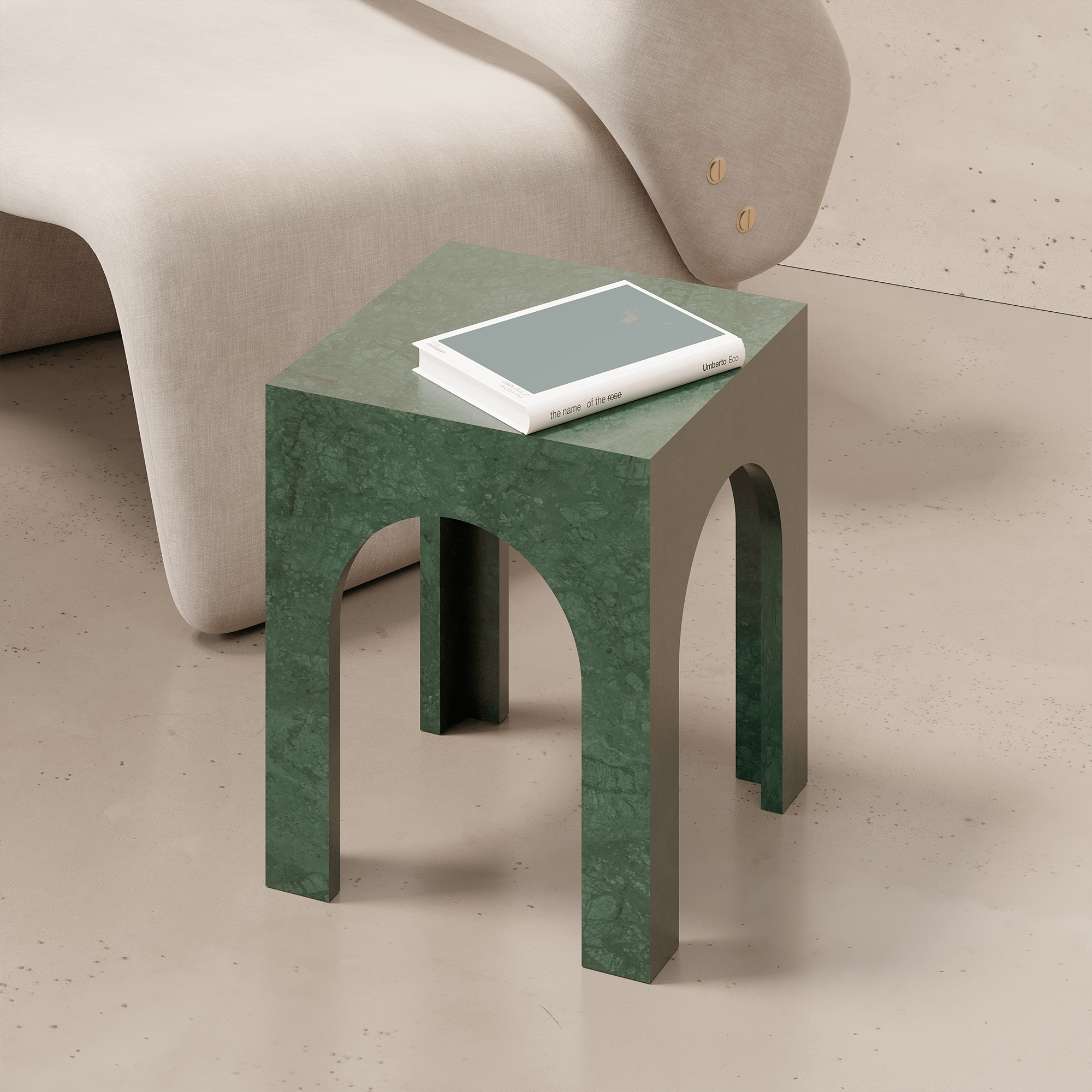 Столик #1 – это многофункциональный мебельный элемент. В гостиной он легко трансформируется в торцевой или приставной журнальный столик, а в спальне – в удобный прикроватный. Великолепные характеристики природного камня обеспечивают ему устойчивость к воде и влажности, что делает возможным его использование в душевых, ванных комнатах, бассейнах и СПА-зонах.